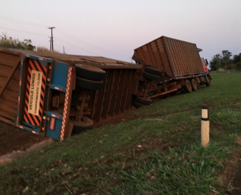 Caminhão canavieiro tomba carreta na curva do tombo em Bandeirantes