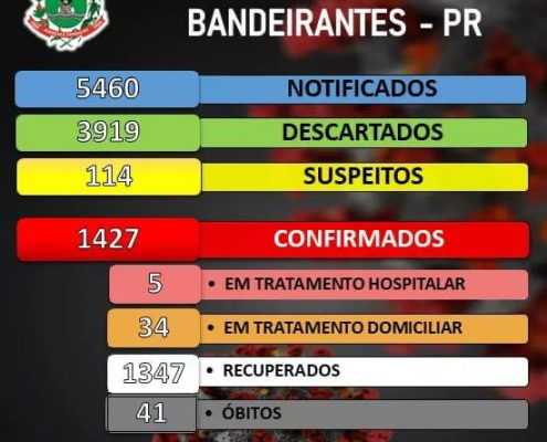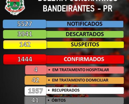 Boletim de acompanhamento de casos de Coronavírus em Bandeirantes desta segunda-feira, 04/01