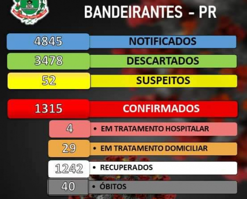 Boletim de acompanhamento de casos de Coronavírus em Bandeirantes desta terça-feira- 15/12