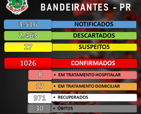 Boletim de acompanhamento de casos de Coronavírus em Bandeirantes desta quarta-feira, 14/10