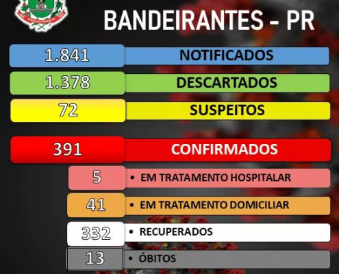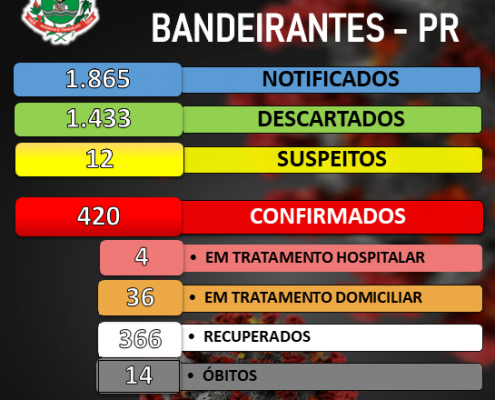 Boletim diário de acompanhamento de casos de Coronavírus em Bandeirantes desta quinta-feira, 20/08