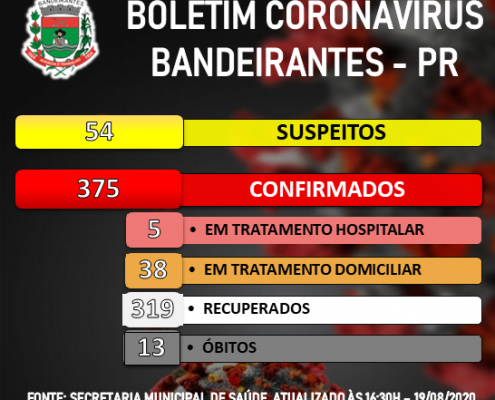 Boletim diário de acompanhamento de casos de Coronavírus em Bandeirantes desta quarta-feira, 19/08