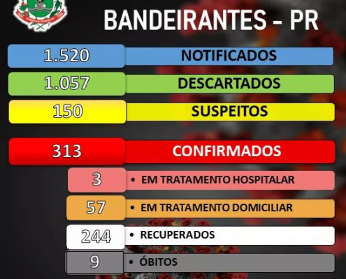 Boletim diário de acompanhamento de casos de Coronavírus em Bandeirantes desta sexta-feira, 07/08