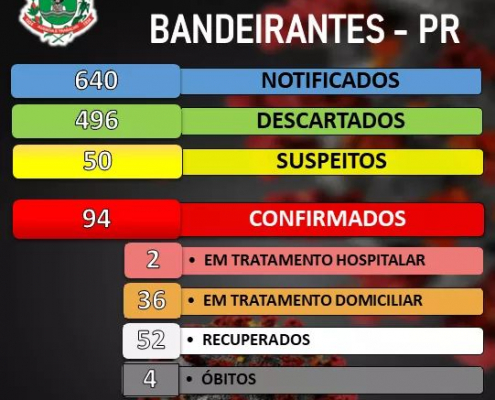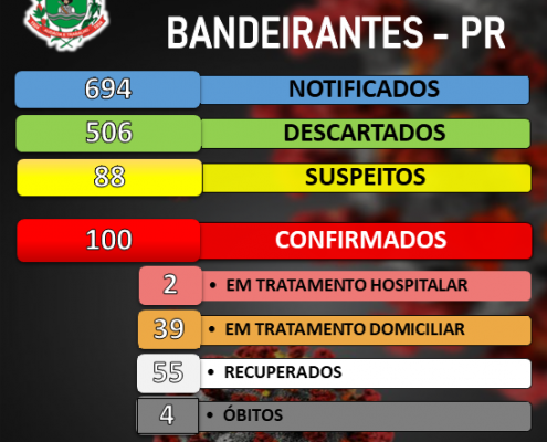 Boletim diário de acompanhamento de casos de Coronavírus em Bandeirantes desta quinta-feira, 10/07