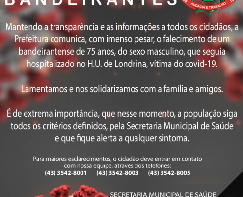 horus2020-04-17 17:22:252020-04-17 17:44:021ª morte confirmada por coronavírus em Bandeirantes