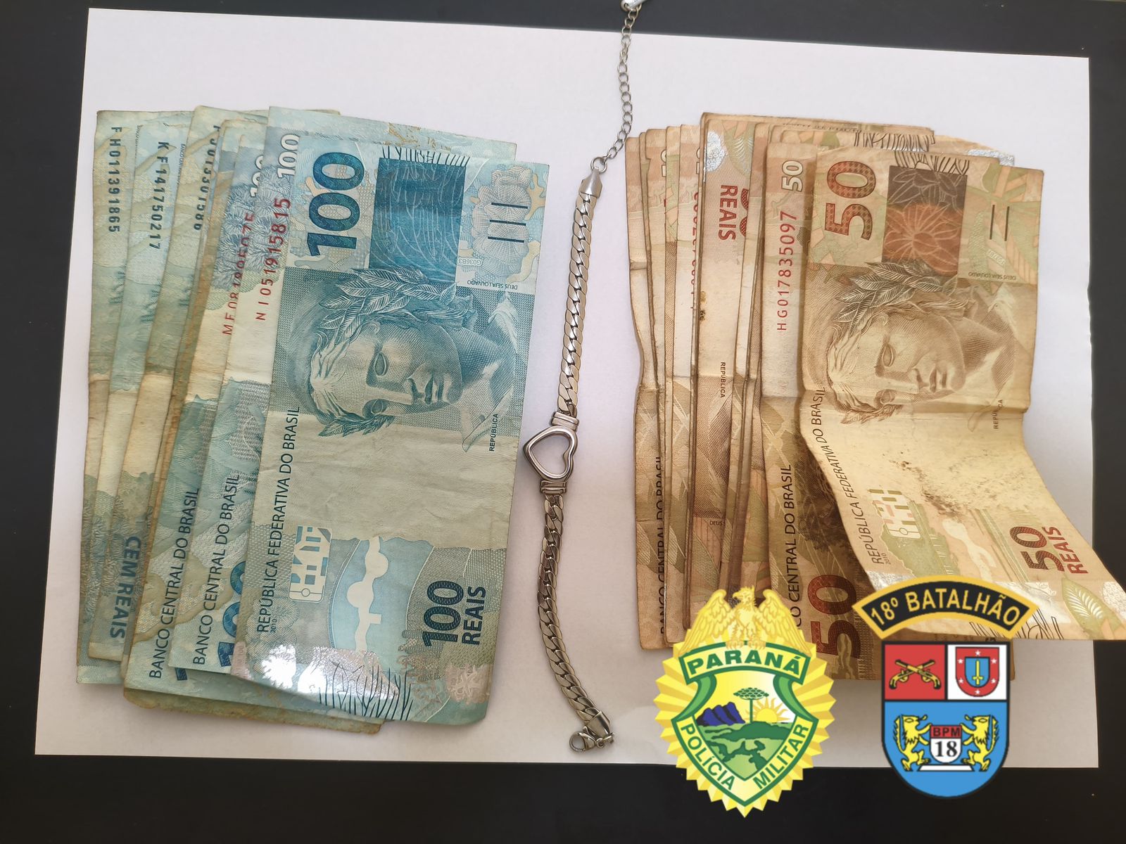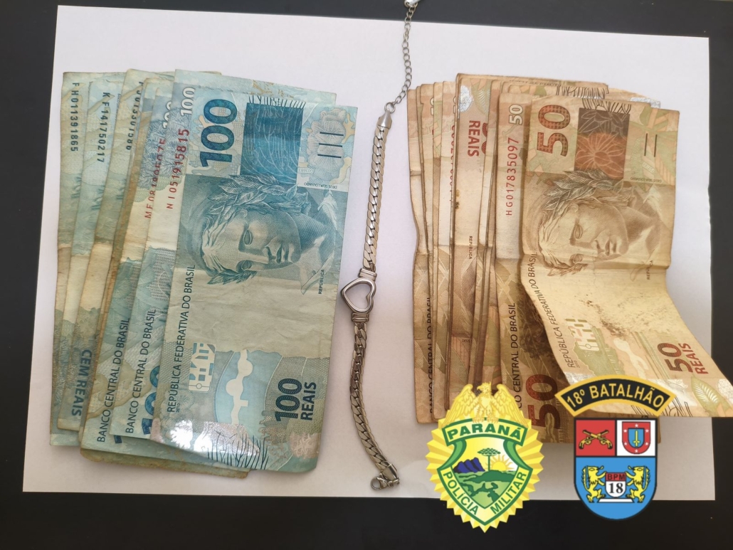 Durante a revista pessoal, foram encontrados R$ 1.850,00 em dinheiro e uma pulseira feminina de prata, reconhecida pela vítima como sendo de sua esposa.