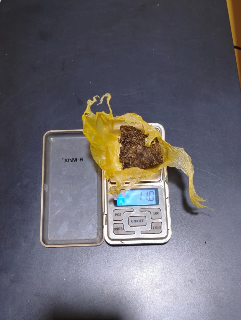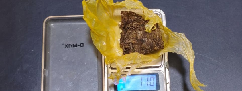 Diante da fundada suspeita, os policiais realizaram a abordagem e, durante revista pessoal no suspeito, localizaram em seu bolso uma porção de substância análoga à maconha, que após pesagem totalizou 11 gramas. Nos demais abordados, nada de ilícito foi encontrado, sendo eles liberados no local.