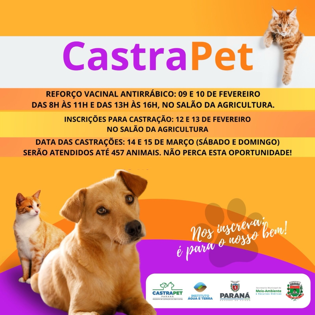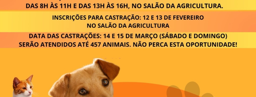 Já as inscrições para a castração serão realizadas nos dias 12 e 13 de fevereiro, no mesmo local e horários. Ao todo, são 350 vagas, além de 30% para cadastro de reserva, distribuídas entre ONGs, beneficiários do CadÚnico e público em geral.