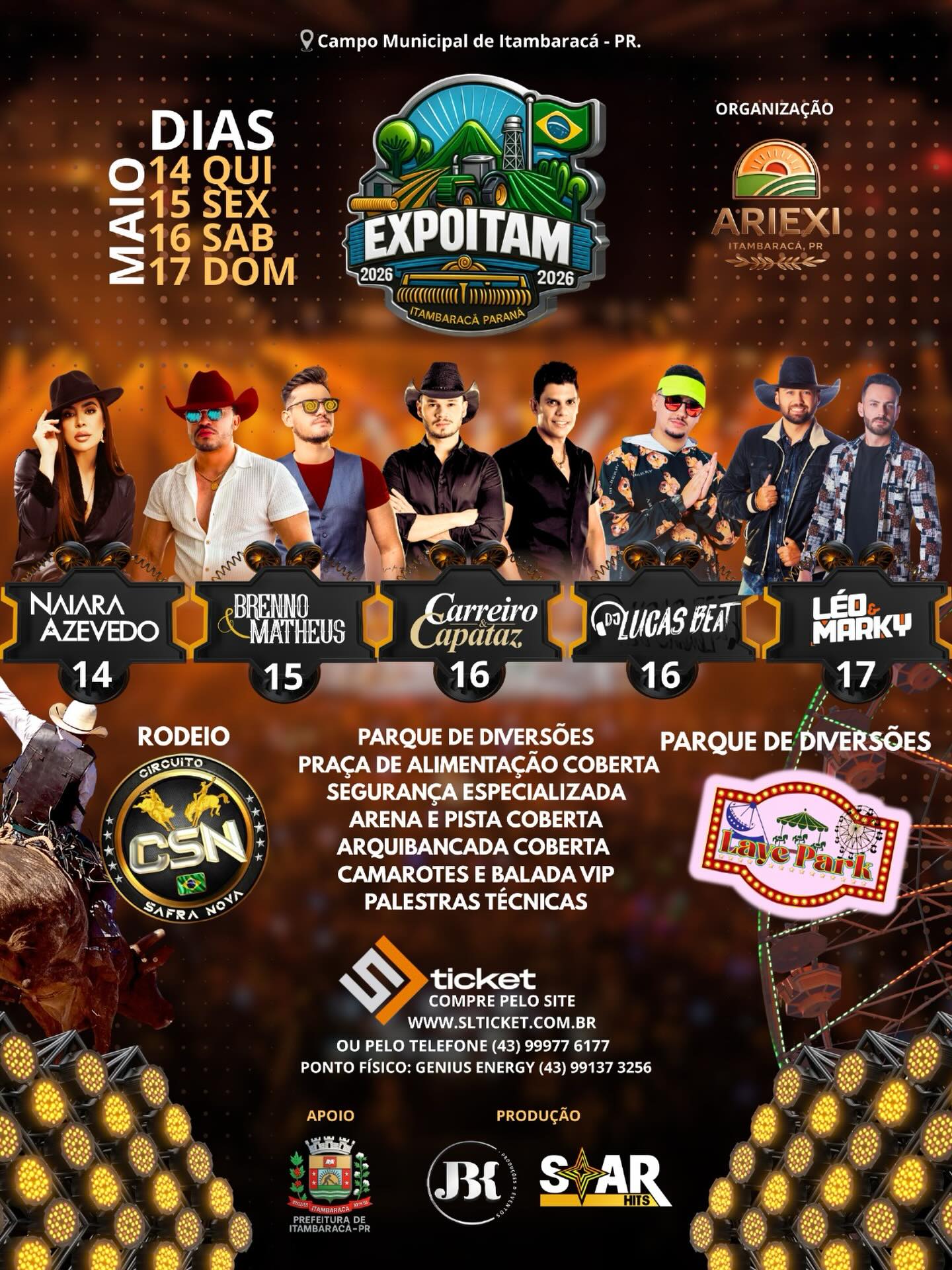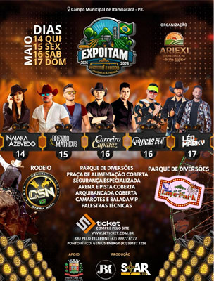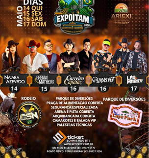 Além dos shows, a EXPOITAM 2026 contará com rodeio em touros do Circuito Safra Nova, reunindo grandes peões e boiadas em uma das atrações mais aguardadas da festa.