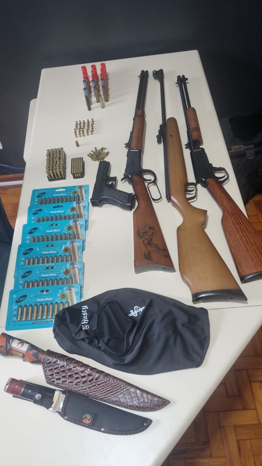 Durante as buscas na residência alvo do mandado, foram localizadas diversas munições e armamentos, entre eles:
