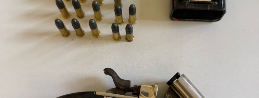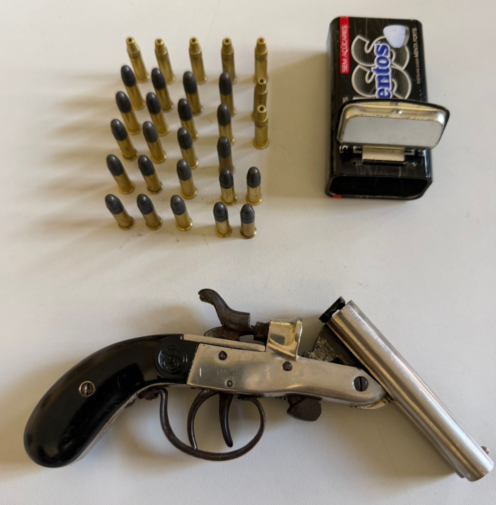 Durante buscas na residência, foi localizada uma arma de fogo do tipo garrucha calibre .22, além de 29 munições intactas do mesmo calibre, que estavam sobre um guarda-roupa.