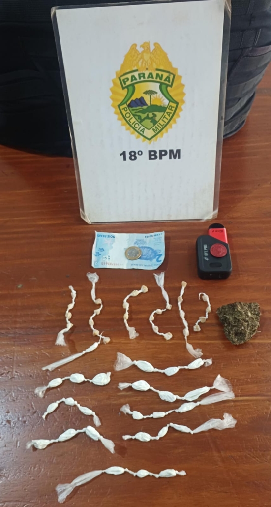Feita a busca pessoal foram localizadas com o passageiro da moto 26 pedras de crack, uma porção de maconha e três em dinheiro.