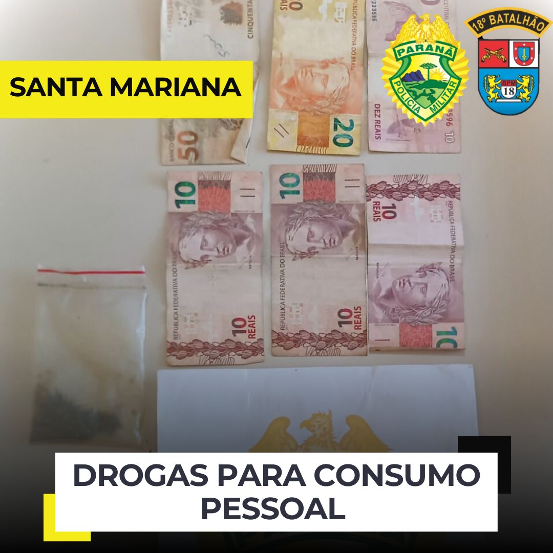 Durante execução da Operação Força Total Brasil, a equipe RPA de Santa Mariana realizando saturação em local alvo de denúncias de tráfico de entorpecentes abordou um indivíduo, sendo que durante busca pessoal foi localizado 1,7g de substância análoga à maconha e R$110,00 em dinheiro trocado.