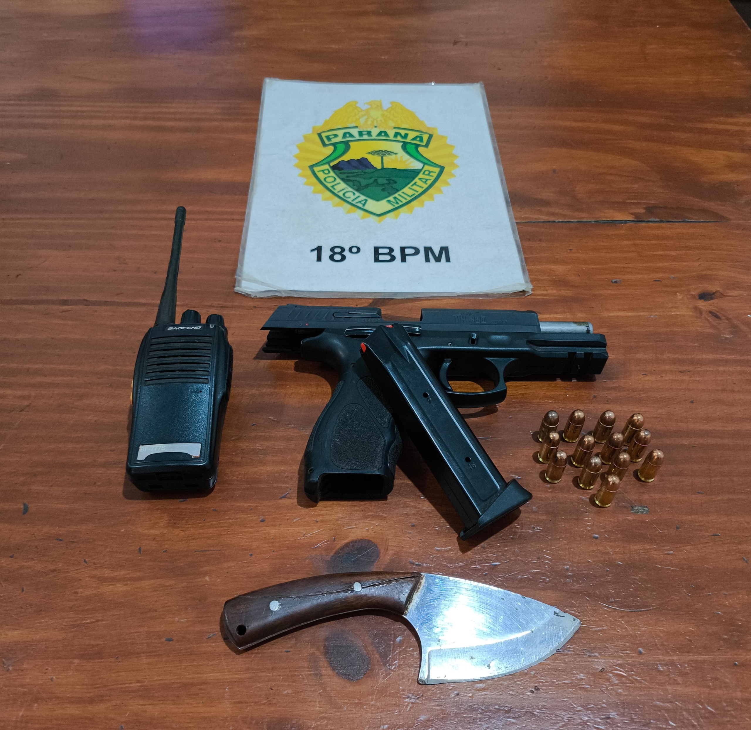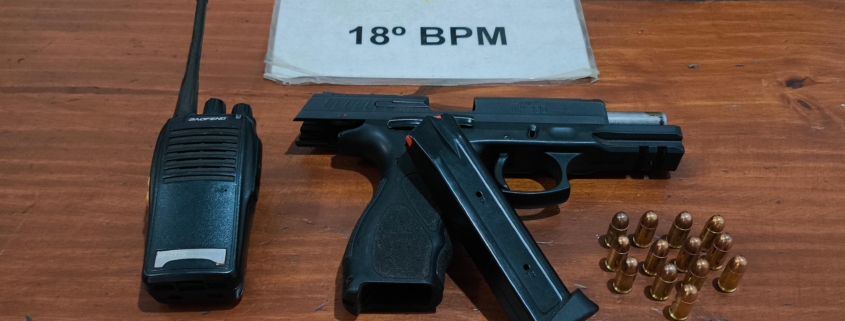 Durante diligências, a equipe obteve êxito em abordar um indivíduo portando uma arma de fogo do tipo pistola, marca Taurus, calibre .380, com um carregador e treze munições. O abordado também portava um rádio comunicador do tipo HT e uma faca do tipo skinner, popularmente conhecida como “cutelinho”.